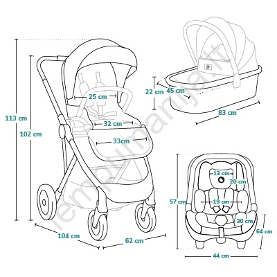 • Gausus priedų komplektas: krepšys, moskitiera, lietaus apsauga, vystymo kilimėlis, kojų uždangalai, čiužinys.