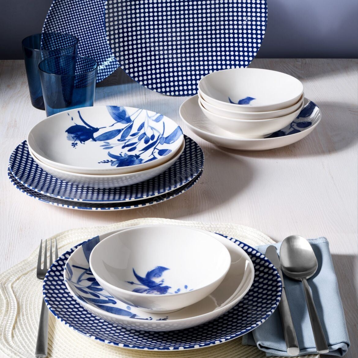 14 dalių stalo indų rinkinys, balta/mėlyna, porcelianas