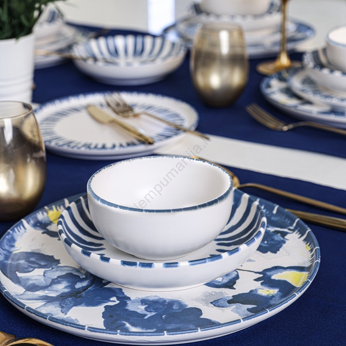 24 dalių stalo indų rinkinys, baltas/mėlynas/iš akmens masės | Lempumanija