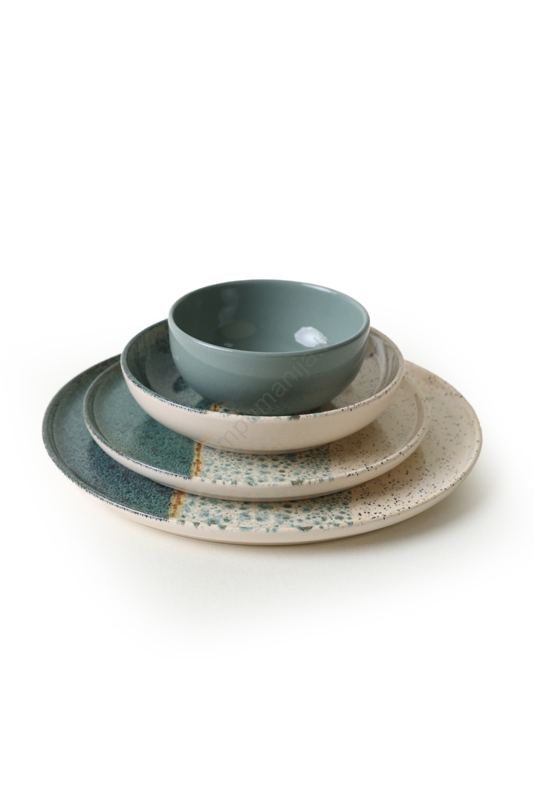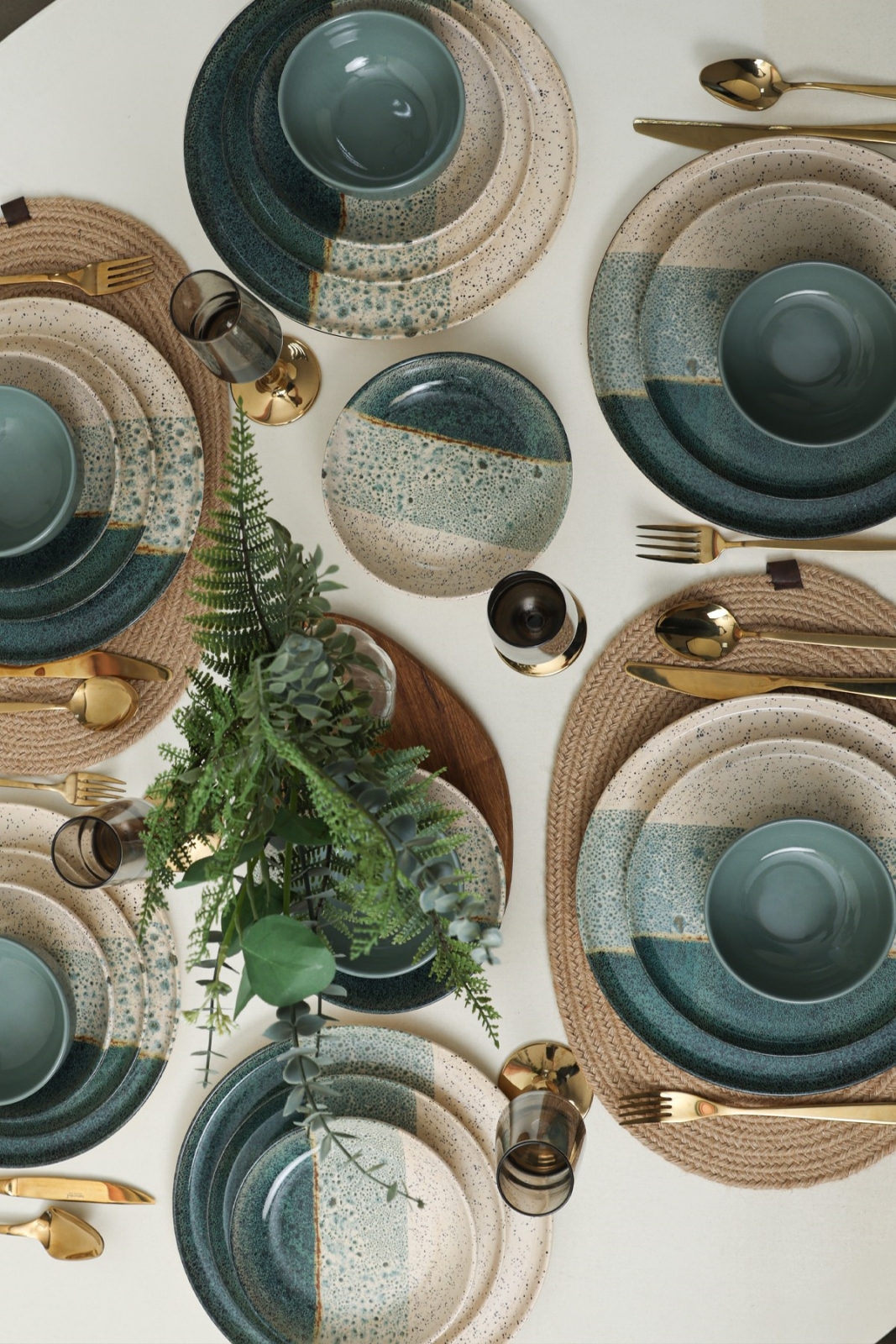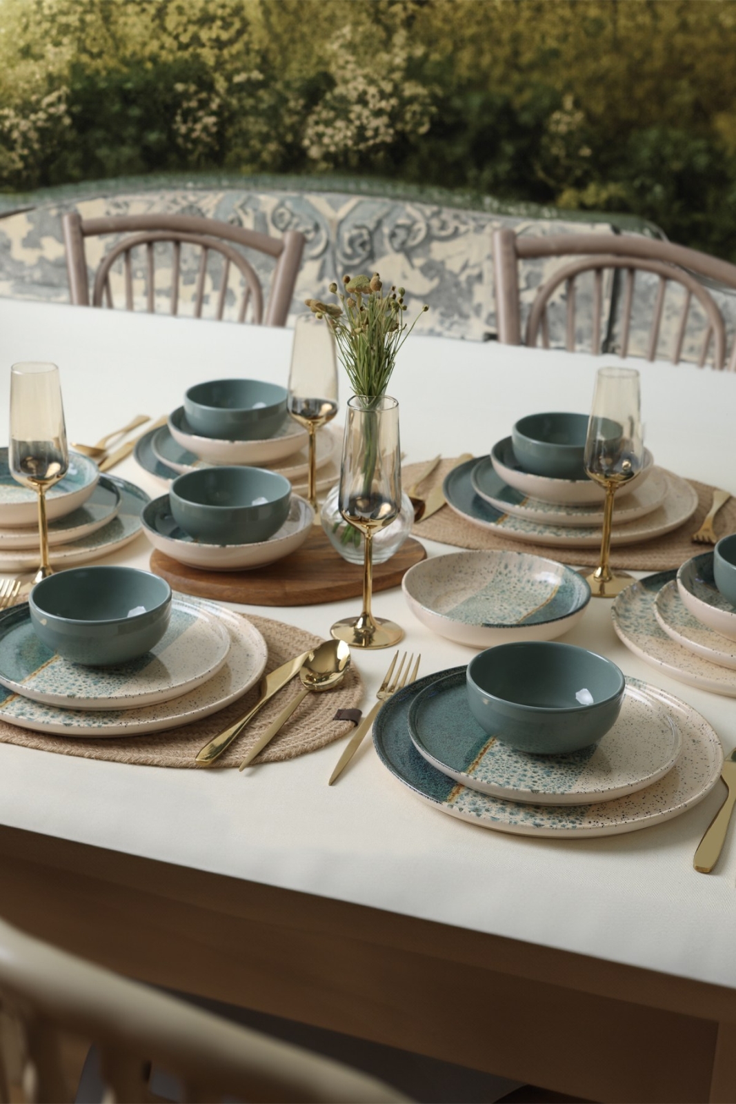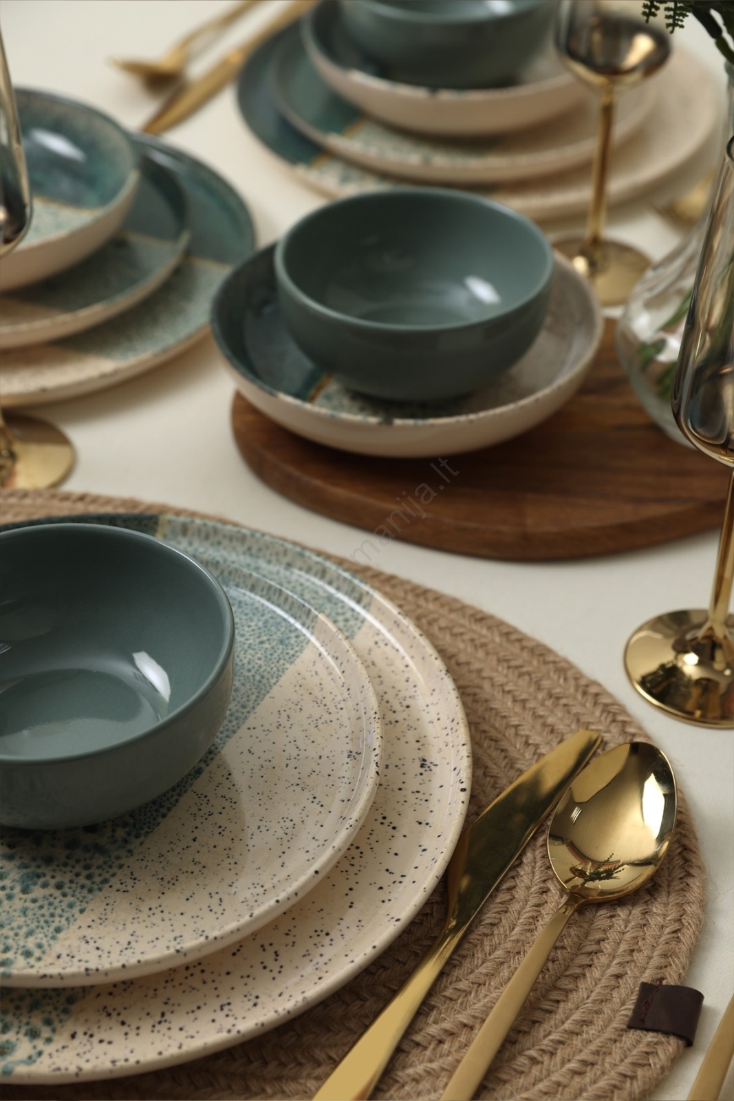 24 dalių valgomojo indų rinkinys, turkio ir kreminės spalvų, pagamintas iš akmens masės