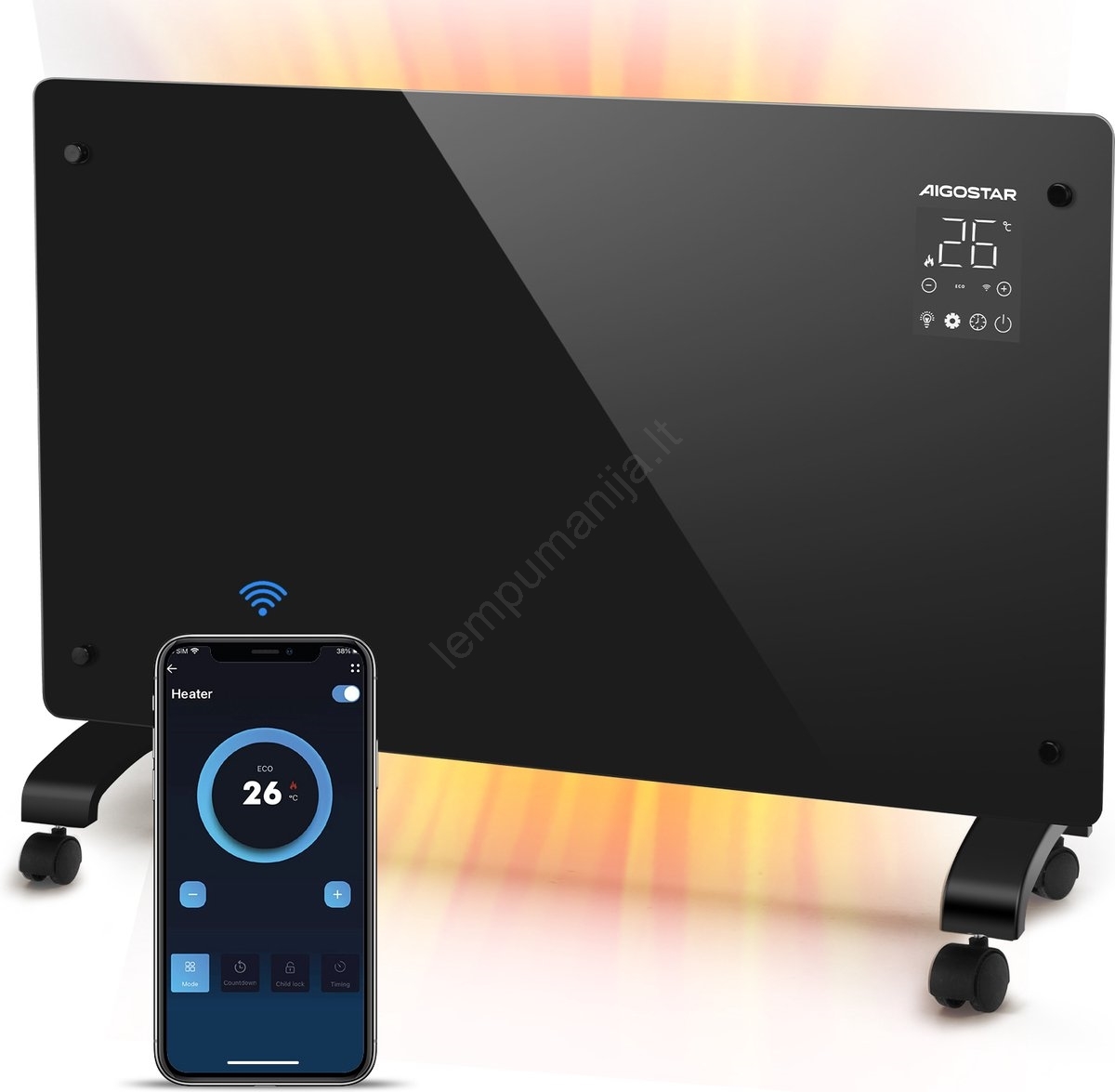 • Konvektorius prisijungia prie programėlės AigoSmart, iš kurios galite valdyti režimus, temperatūrą, trumpą atgalinį laikmatį ir savaitinį grafiką.