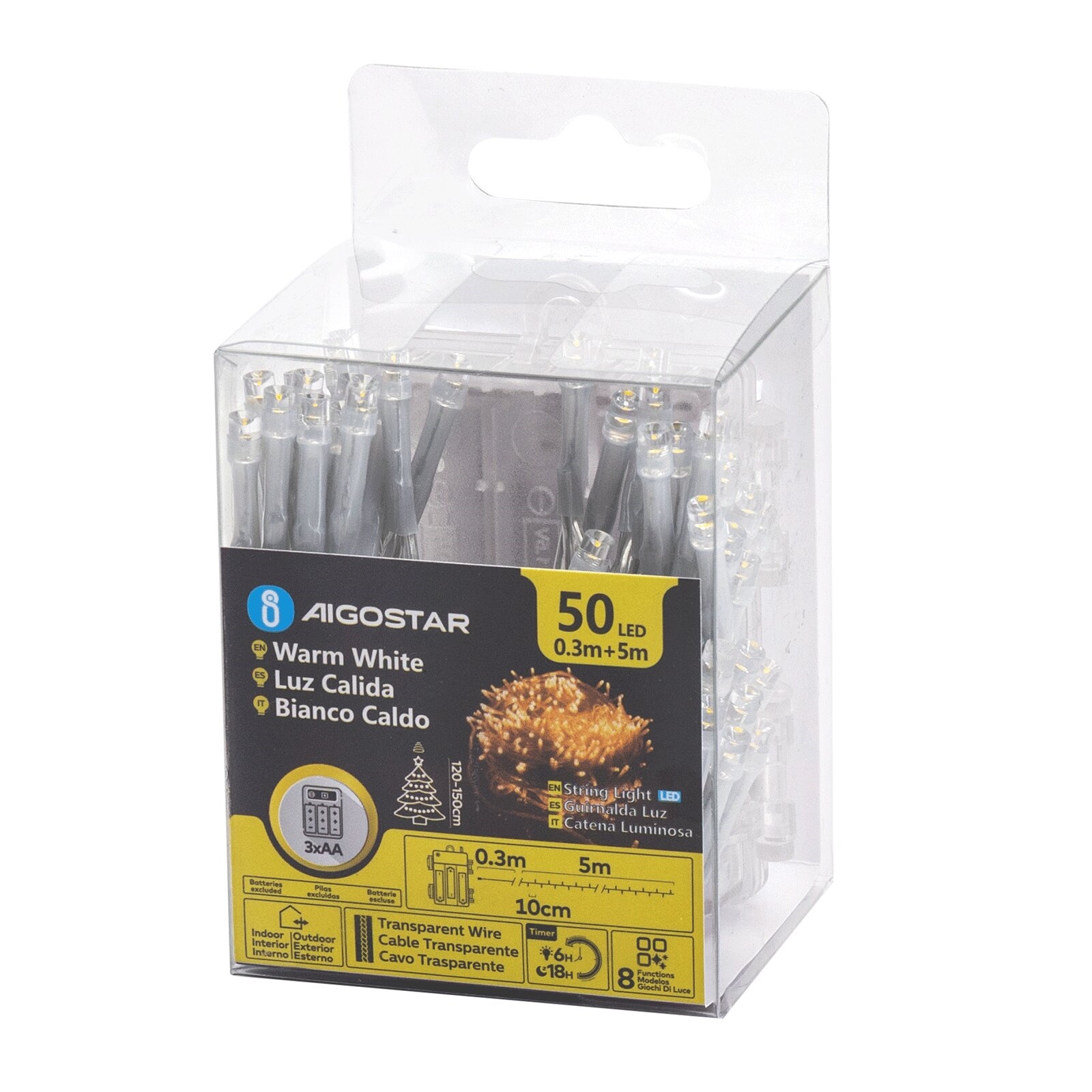 Aigostar - LED lauko girlianda 50 LED / 8 režimų, 3x AA, 5,3 m, IP44, šiltai balta