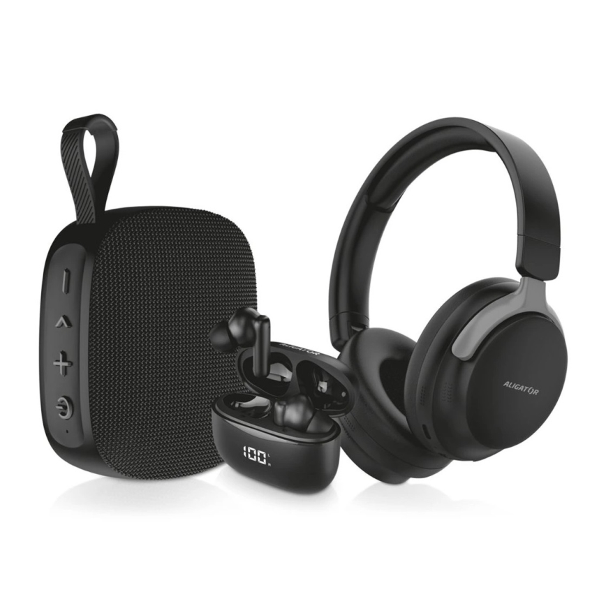 Aligator AUC001 - AUDIO KOMPLEKTAS 3 viename: ausinės už ausų 150 mAh, belaidės ausinės 200 mAh + 2x 30 mAh ir garsiakalbis 1200 mAh