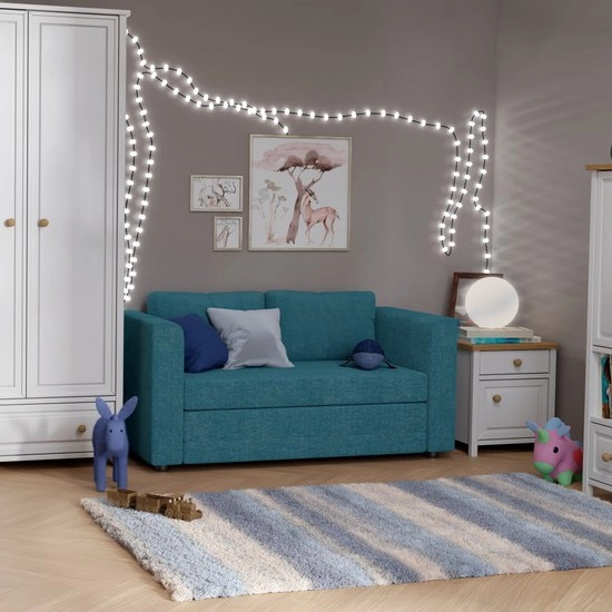 • Apmušta išskleidžiama dvivietė sofa su porankiais LAYLA, mėlyna
