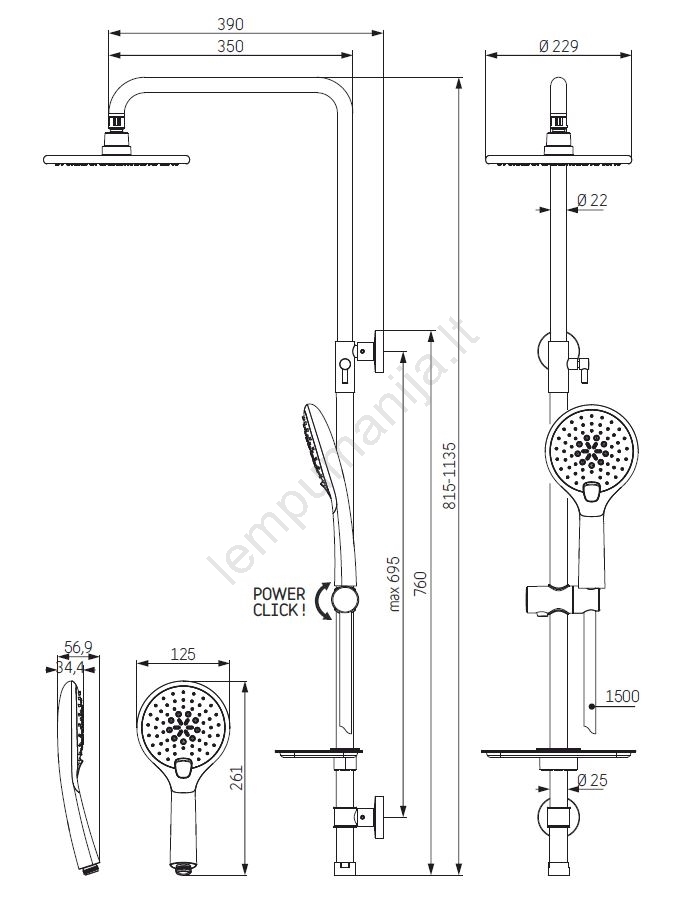 • Viršutinė ir rankinė dušo galvutė turi purkštukus, apsaugančius nuo kalkių.