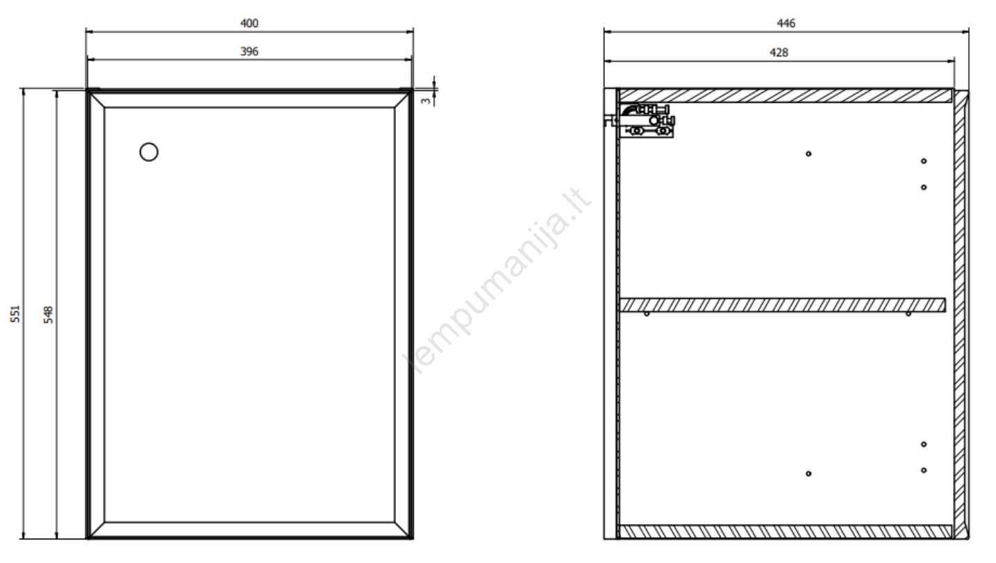 • Priekinė dalis, korpusas ir vidinė lentyna pagaminti iš 16 mm drožlių plokštės su matinio juodo lako apdaila.