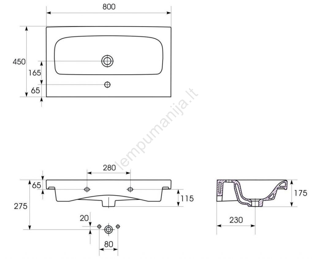 • Keraminis praustuvas turi klasikinę stačiakampę formą su angomis maišytuvui ir perpylimo sistemai.