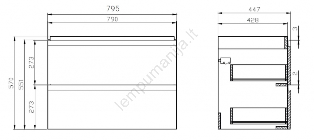 • Spintelėje yra dvi erdvios stalčiai su minkštu uždarymu ir paslėptomis rankenomis.