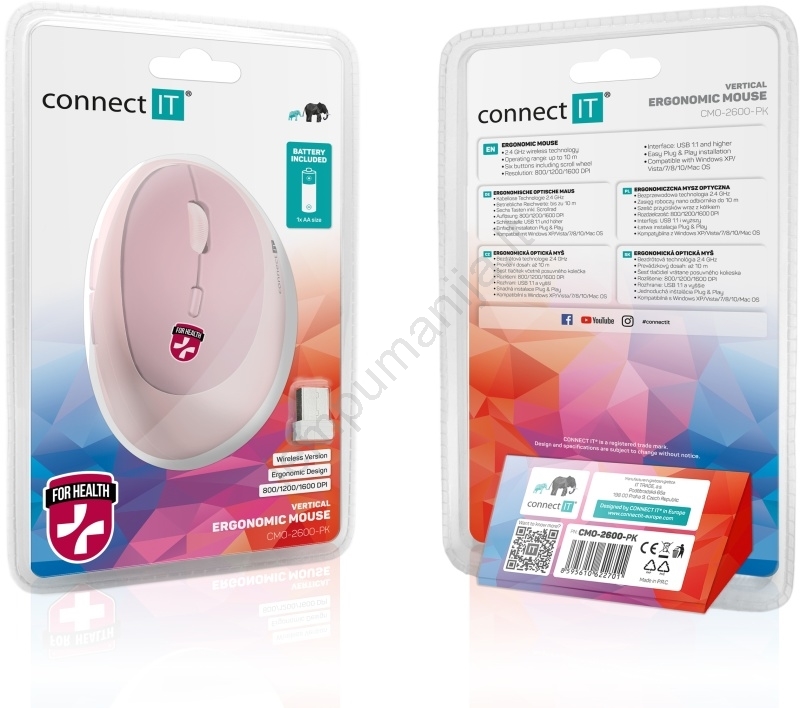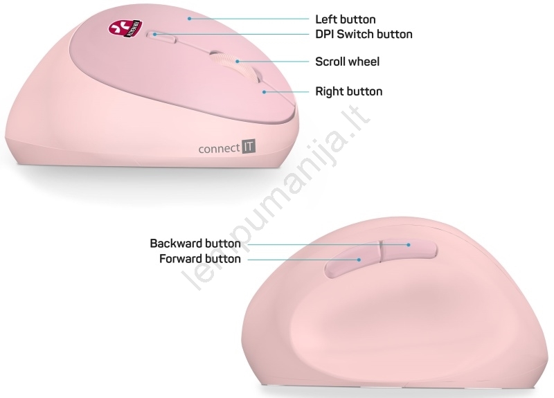 CONNECT IT CMO-2600-PK - Ergonomiška belaidė pelė 800/1200/1600 DPI, 1xAA, rožinė