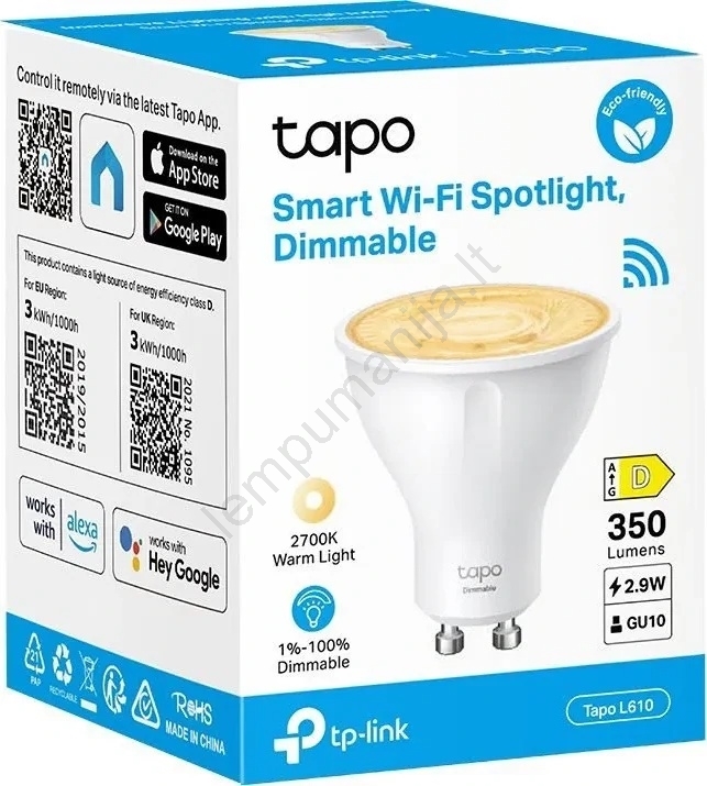 • Išmanioji LED lemputė TP-Link Tapo L610 montuojama į įprastą GU10 lizdą ir veikia be papildomo valdymo tilto.