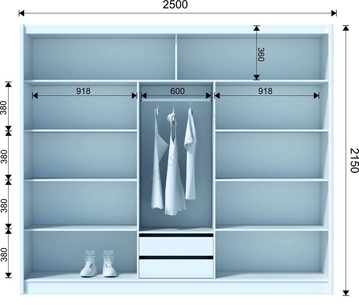 • Spinta turi 8 atviras lentynas, drabužių kabyklą, 2 viršutines lentynas ir 2 stalčius krepšiams bei sezoniniams daiktams laikyti.