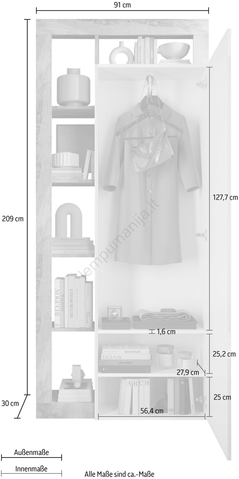 • Spinta turi 6 atviras lentynas, drabužių pakabinimo strypą ir 2 vidines lentynas krepšiams bei sezoniniams daiktams laikyti.