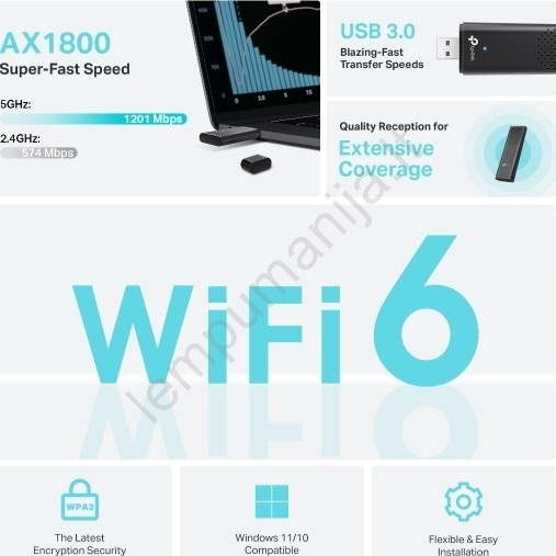 • Greita Wi-Fi 6 - Perženkite gigabitų ribas su greičiais iki 1201 Mb/s (5 GHz) + 574 Mb/s (2.4 GHz).