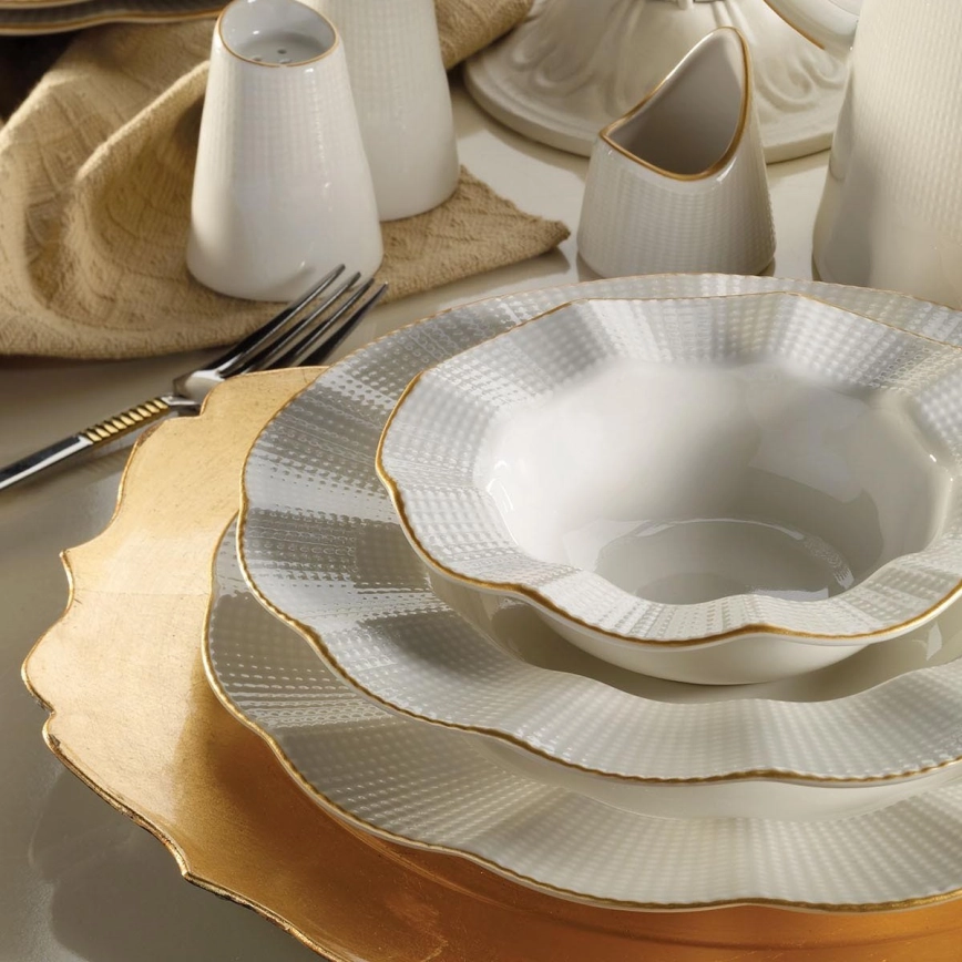 Elegantiškas 26 dalių stalo indų rinkinys, baltas su auksiniais akcentais, pagamintas iš porceliano