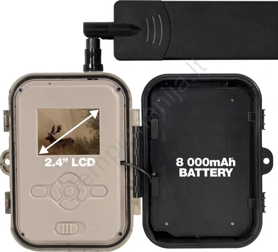 • Pakuotės turinys: medžioklinė kamera, vartotojo vadovas, microSD kortelių skaitytuvas, USB-C kabelis, 12V/2A adapteris, 4G antena, įdėta 8 000 mAh baterija, įdėta 16 GB atminties kortelė, tvirtinimo dirželis.