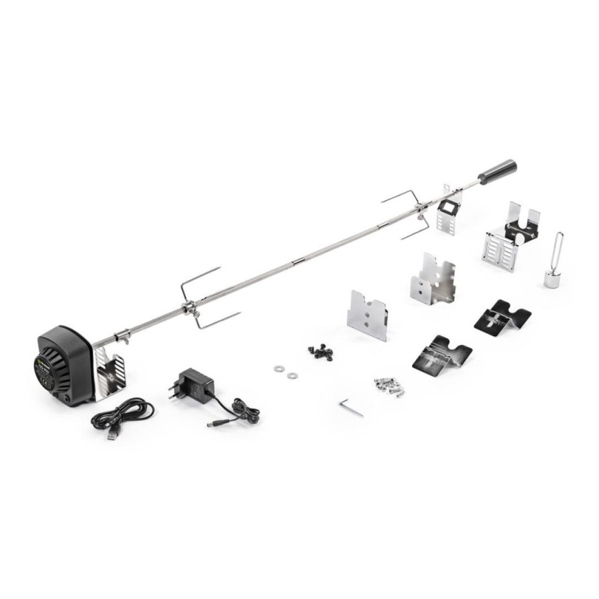 • Patogus nerūdijančio plieno kepsninės iešmas su elektriniu varikliu užtikrina tolygų mėsos sukimąsi.