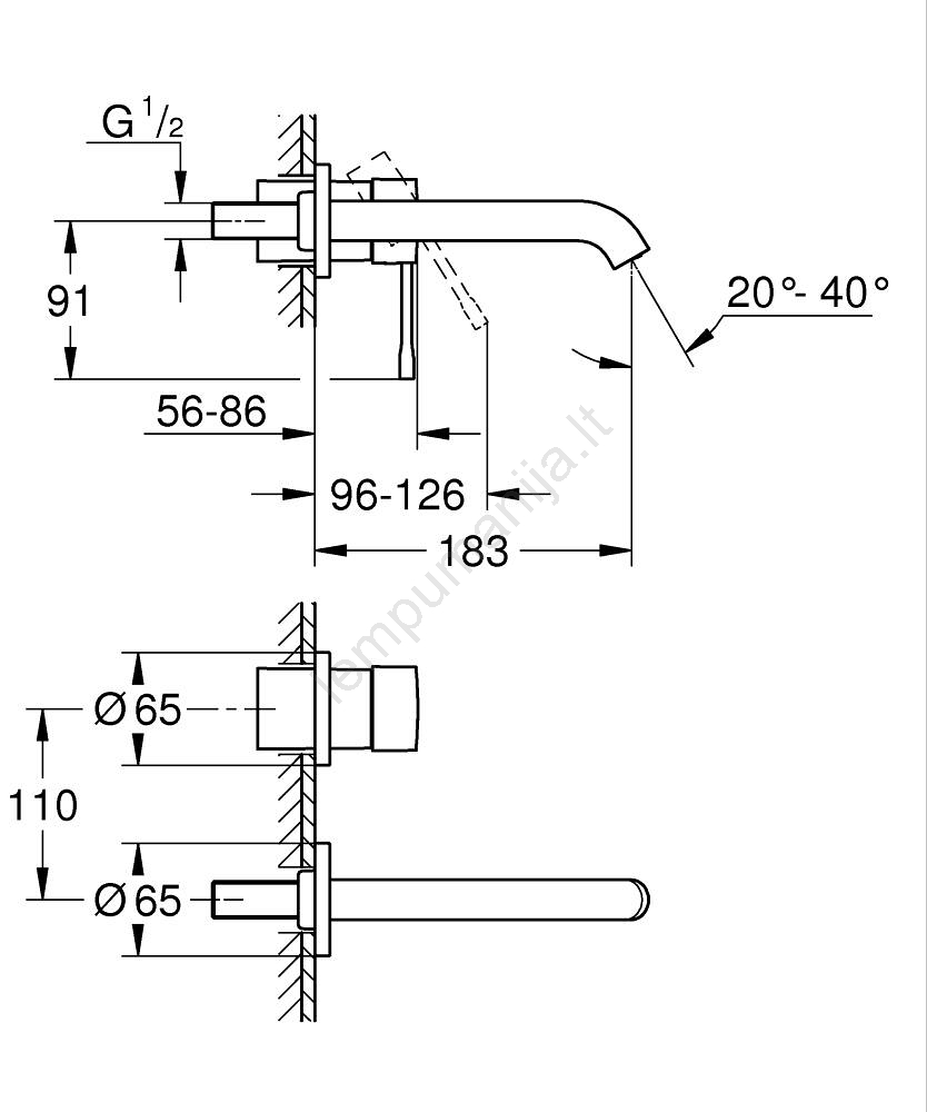 • Atstumas tarp rankenėlės centro ir išleidimo angos yra 110 mm, išleidimo ilgis 183 mm.