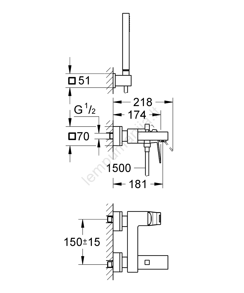 • Komplekte yra rankinis dušas (27 698), sieninis dušo laikiklis (27 693) ir dušo žarna 1500 mm (28 151 000).
