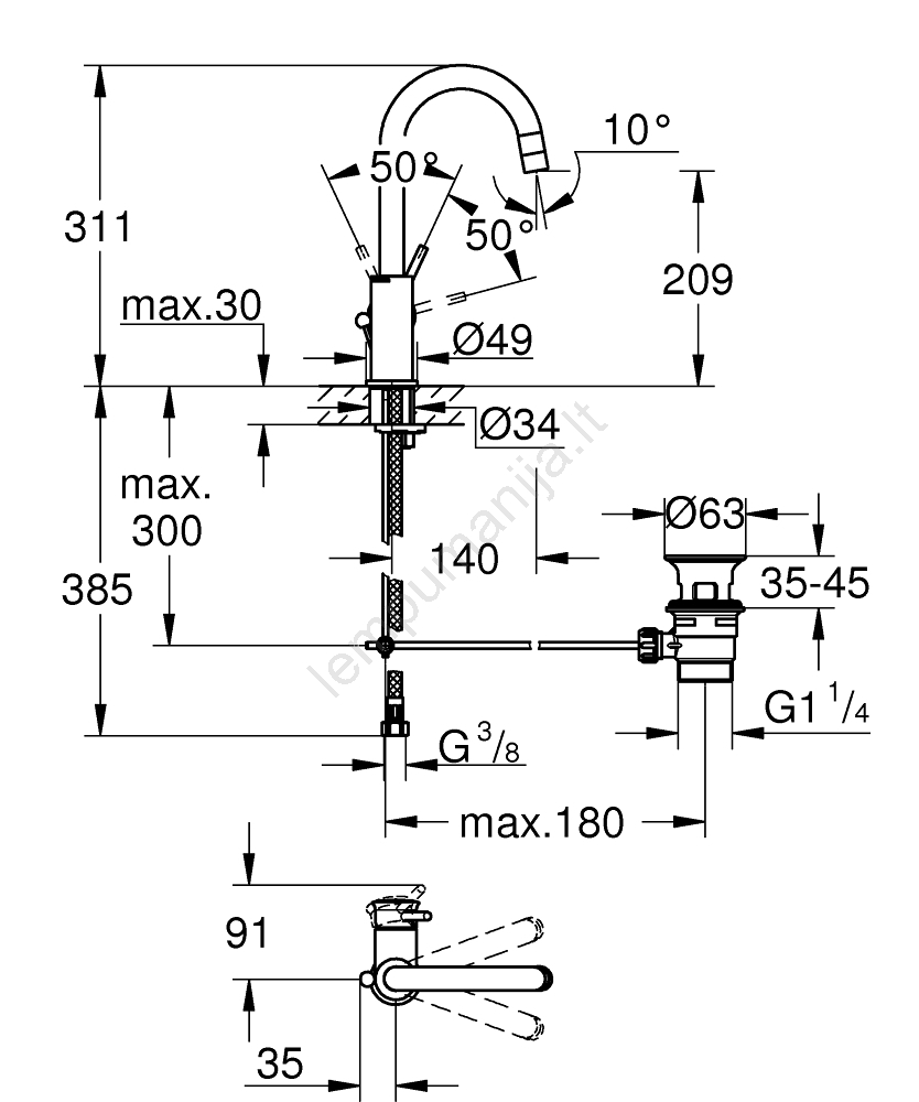 • Maišytuvo aukštis 311 mm ir ištekėjimo ilgis 140 mm suteikia pakankamai vietos patogiam naudojimui.