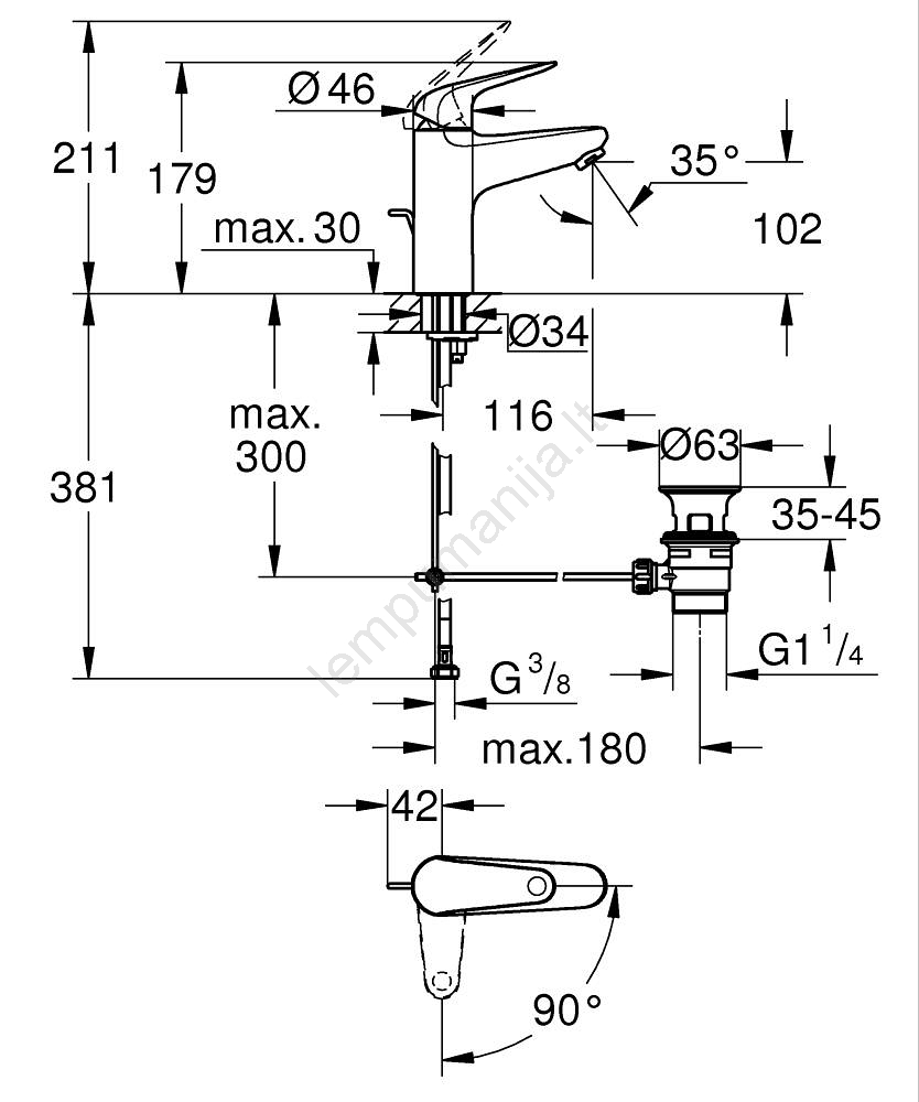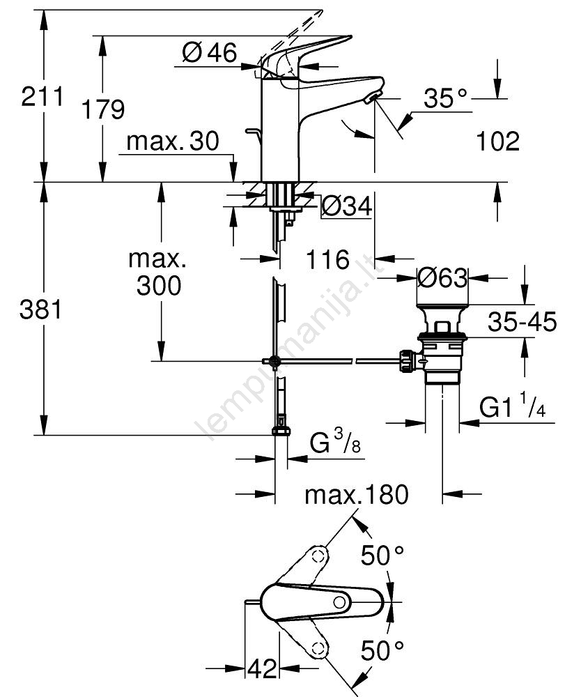 • Svirtinė praustuvo maišytuvas M dydžio, aukštis 179 mm ir snapo ilgis 116 mm.