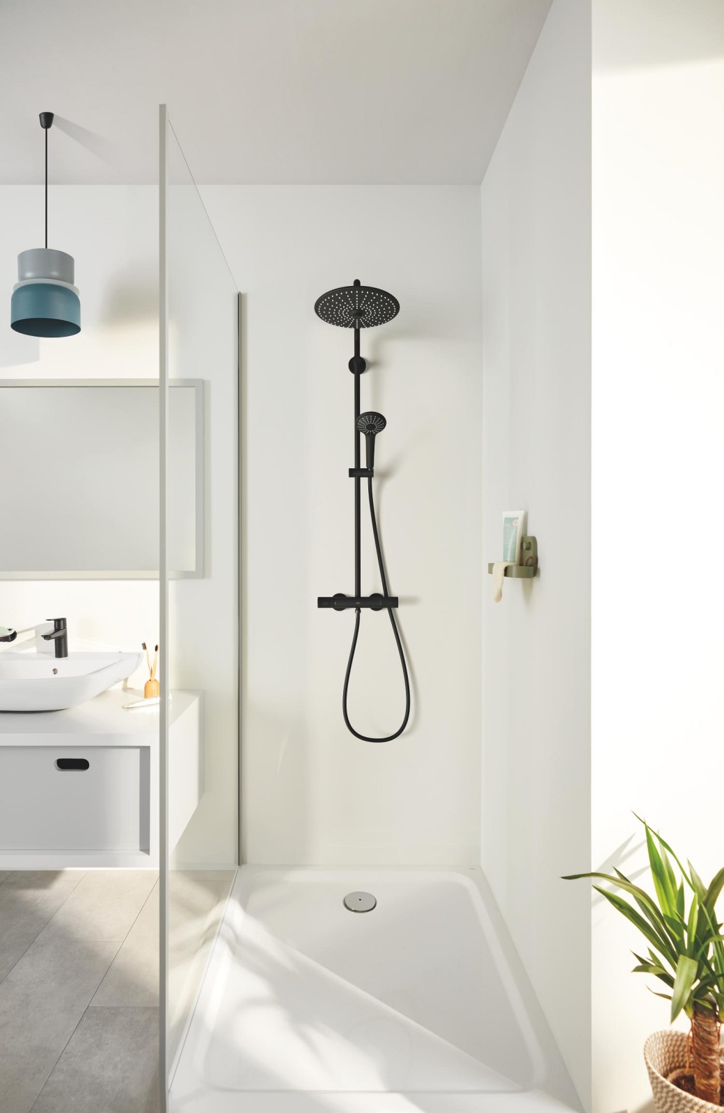 • Elegantiška matinės juodos spalvos Phantom Black dušo sistema, suteikianti vonios kambariui modernų dizainą.