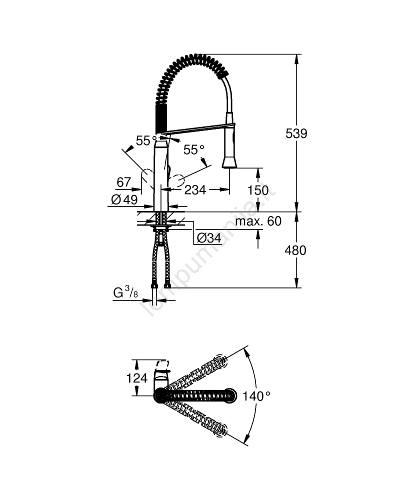 • Sukama išleidimo dalis 140° kampu leidžia lengvai manevruoti ir pasiekti visas kriauklės vietas.