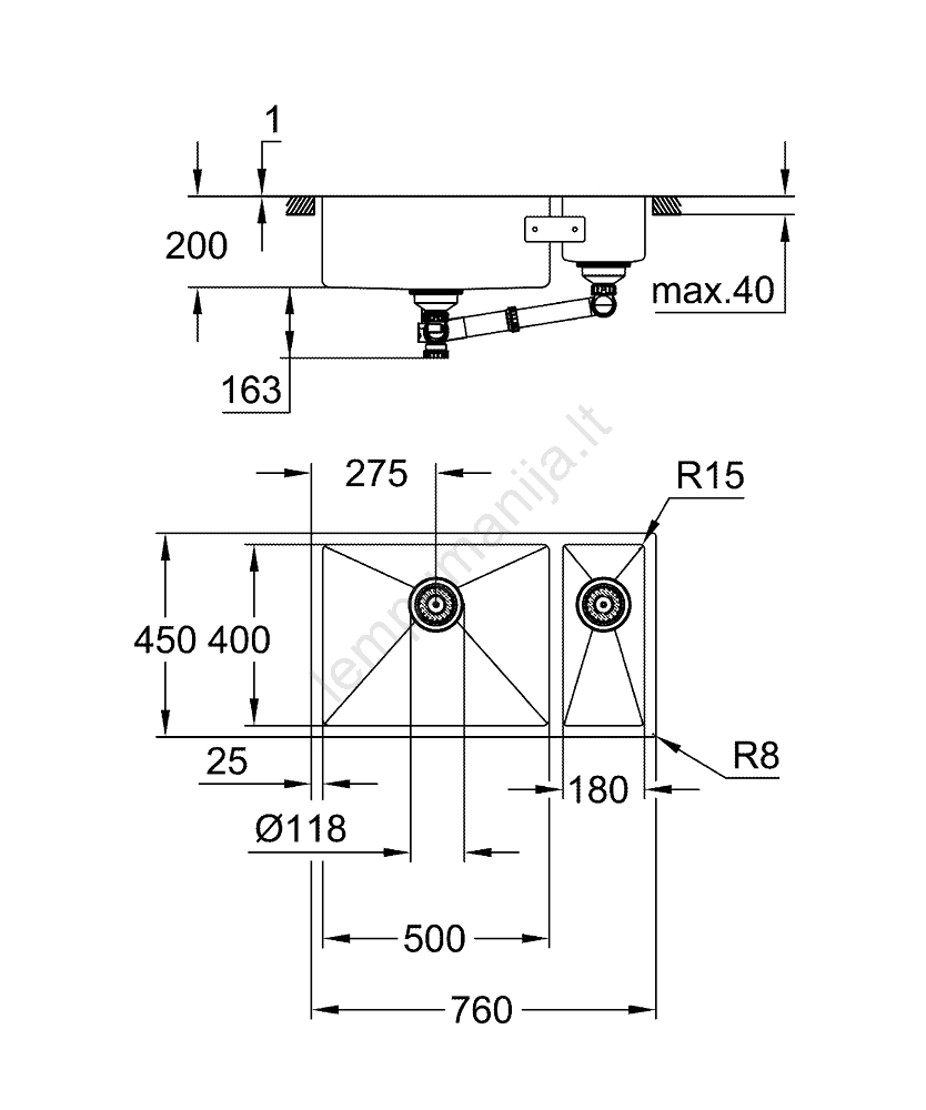 • Pagrindinis dubuo 500 x 400 x 200 mm ir papildomas dubuo 180 x 400 x 140 mm – patogiam indų plovimui.