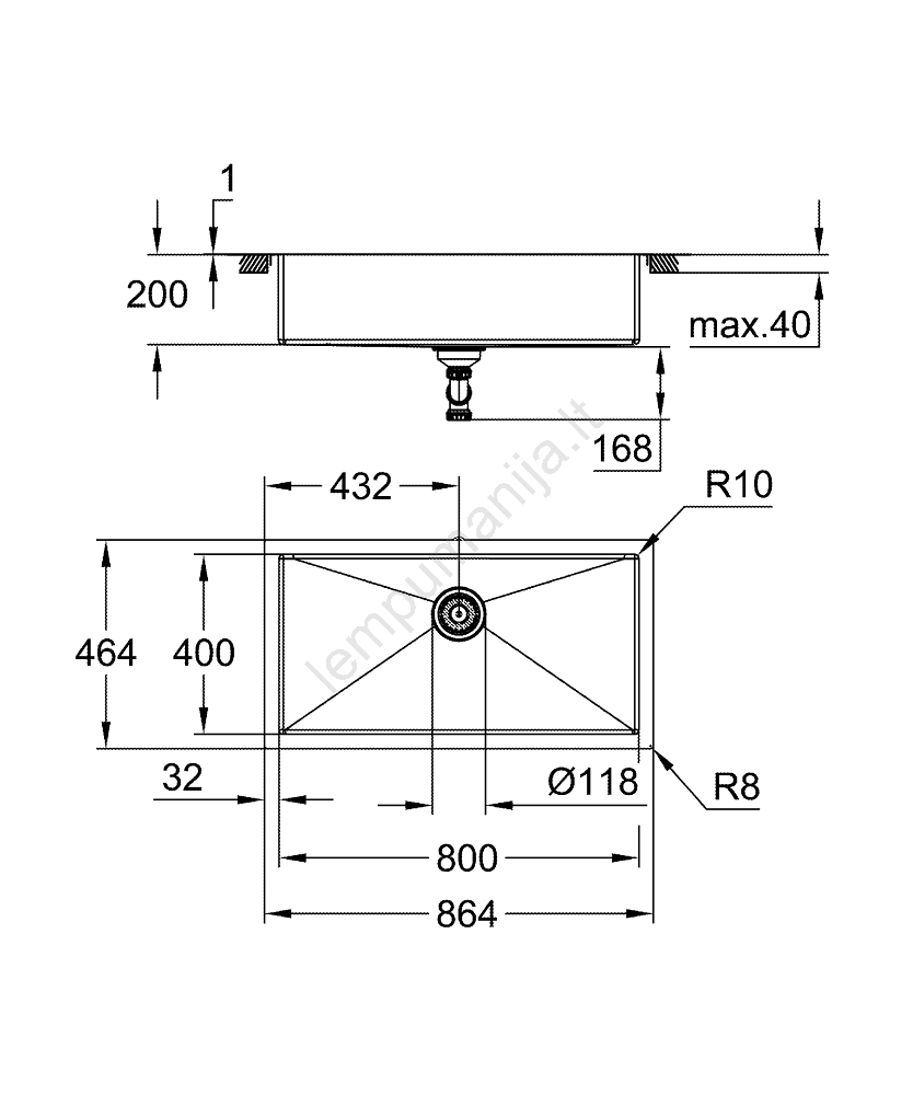 • Matmenys 864 x 464 mm su giliu dubeniu 800 x 400 x 200 mm, palengvinančiu didelių indų plovimą.