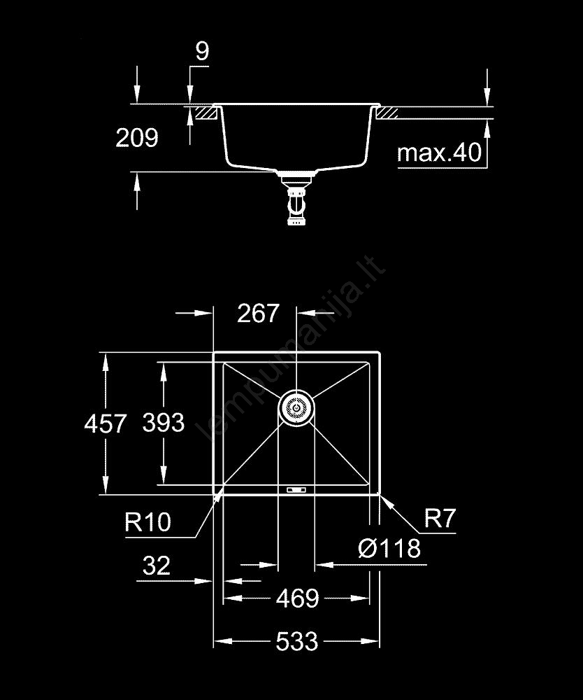 • Bendri matmenys: 533 x 457 mm; dubens matmenys: 469 x 393 x 205 mm.