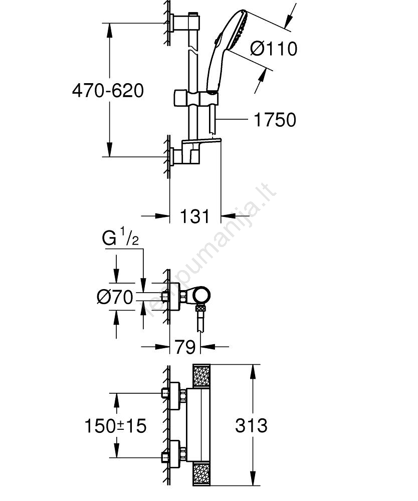 • Dušo komplektas su 600 mm ilgio strypu leidžia lengvai reguliuoti dušo aukštį ir kampą, užtikrinant maksimalų komfortą.