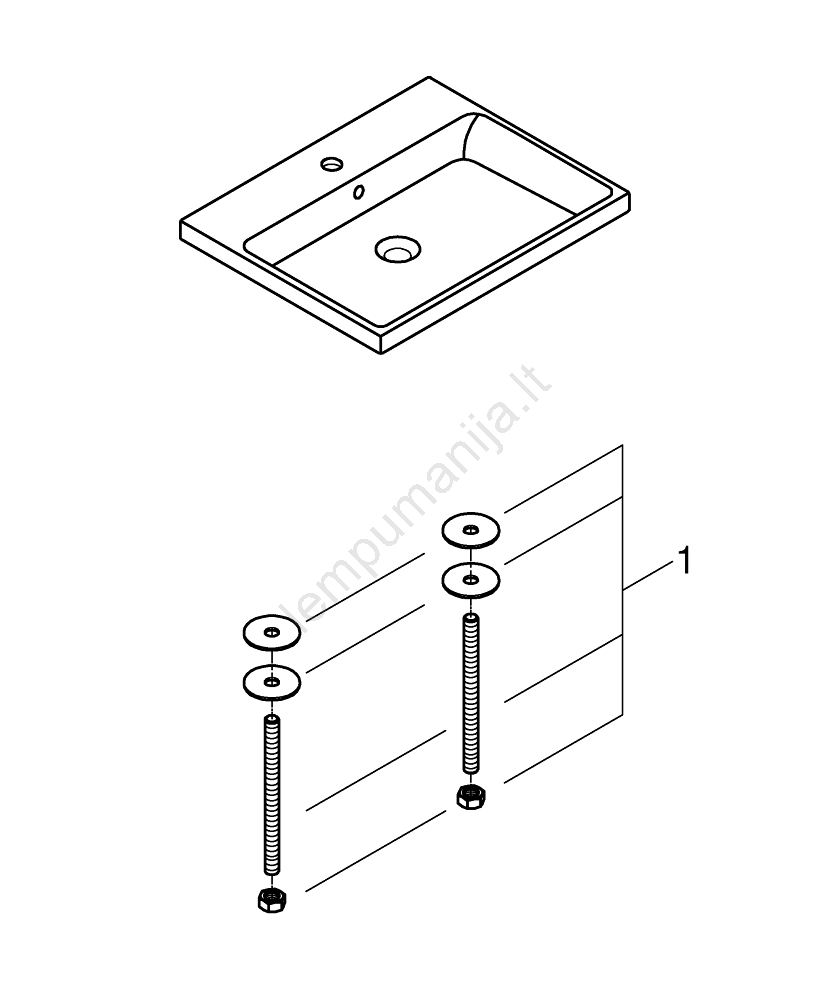 • Praustuvas turi vieną išgręžtą maišytuvo angą ir dvi iš anksto paruoštas angas, suteikiančias montavimo lankstumą.