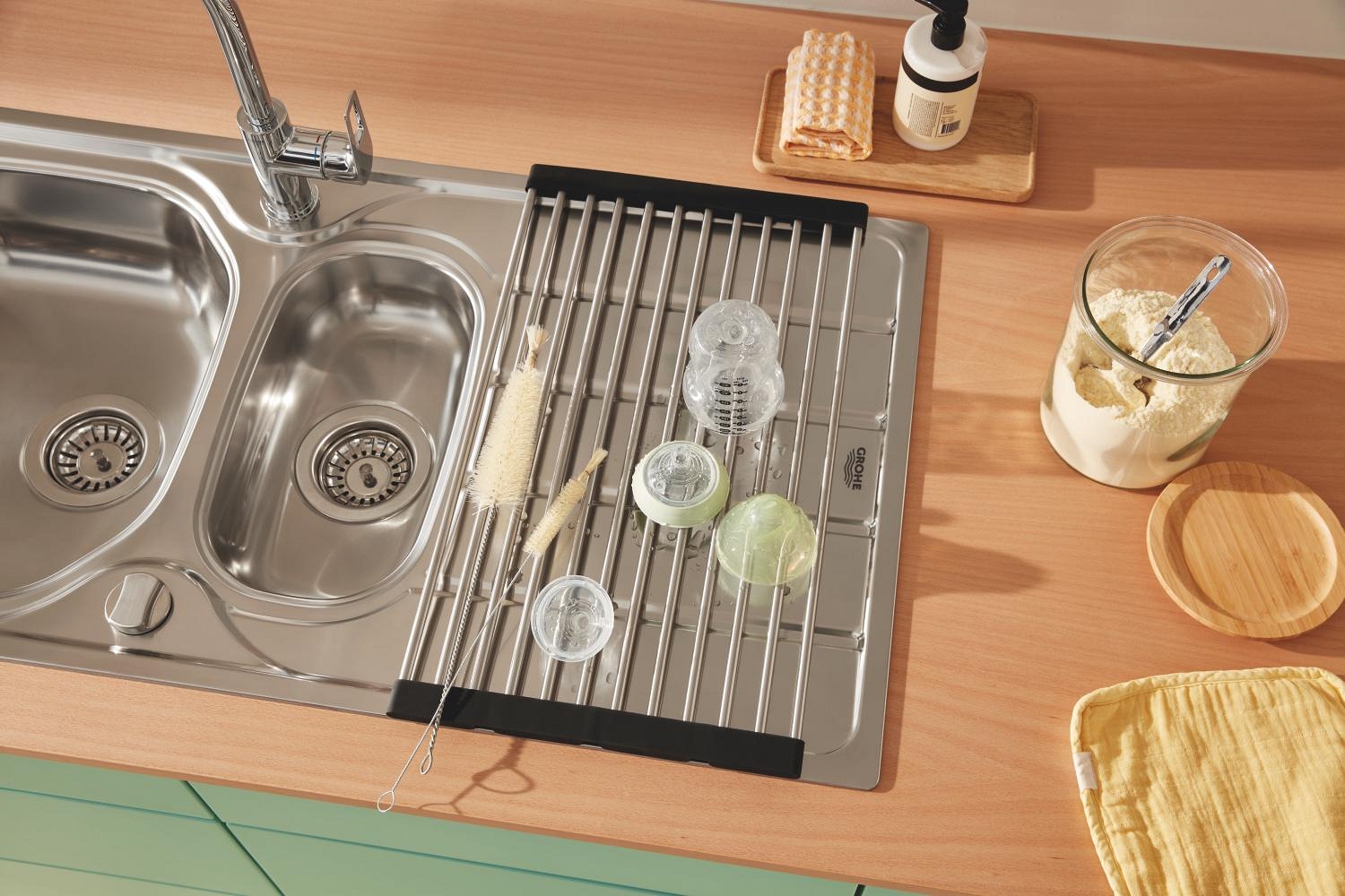 • Sulankstomas nerūdijančio plieno indų džiovyklos padėklas taupantis vietą.