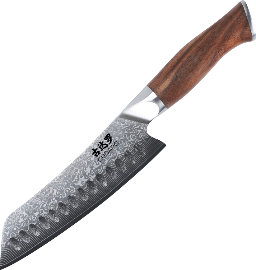 Gudaro - Damasko plieno Santoku virtuvinis peilis TAKUMI 7", 67 sluoksnių plieno, ilgis 17,5 cm, riešutmedžio rankena