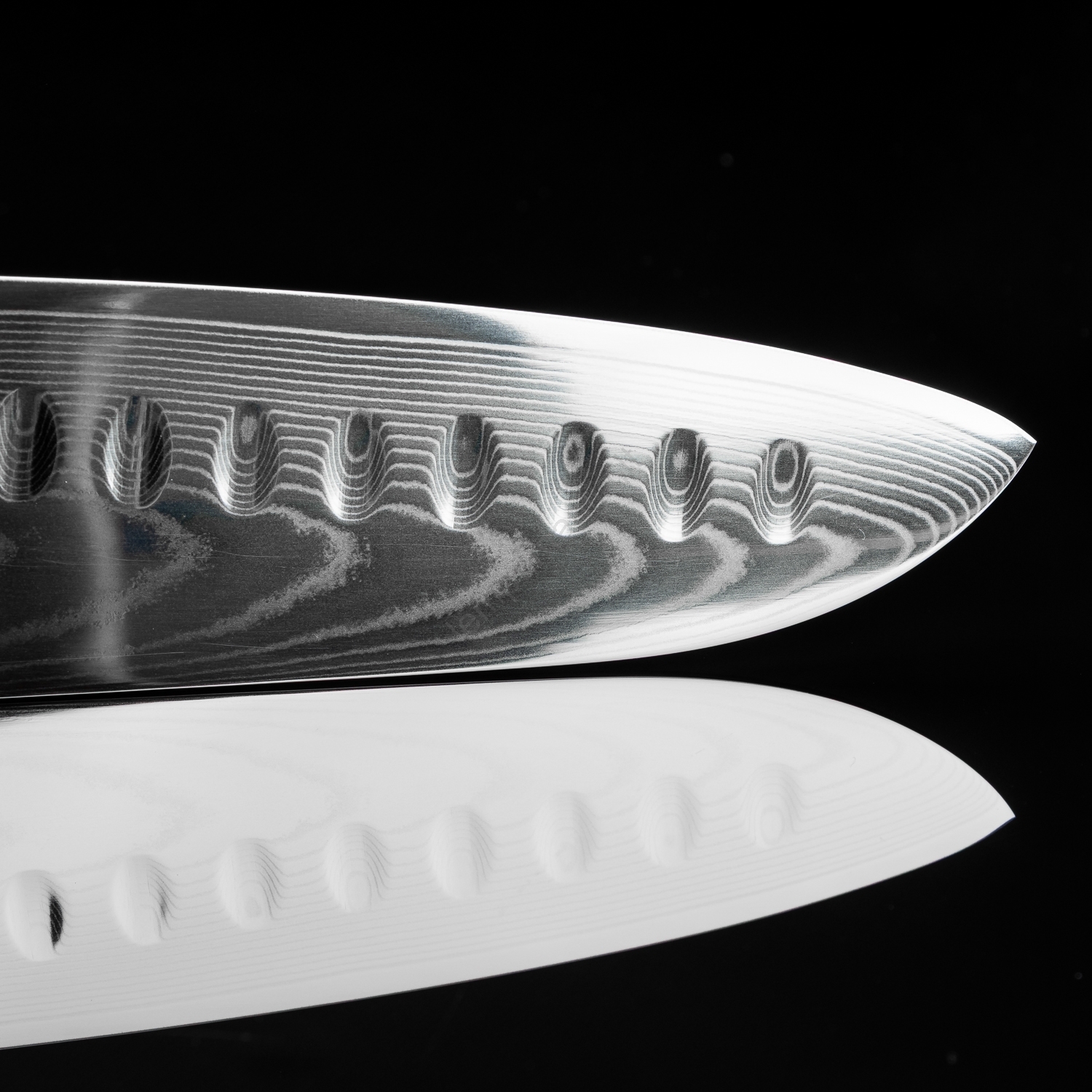 • Ašmenį, kurio ilgis 180 mm, sudaro 67 sluoksniai damasko plieno su kietu VG10 branduoliu, užtikrinančiu itin aštrumą ir ilgalaikį krašto stabilumą.