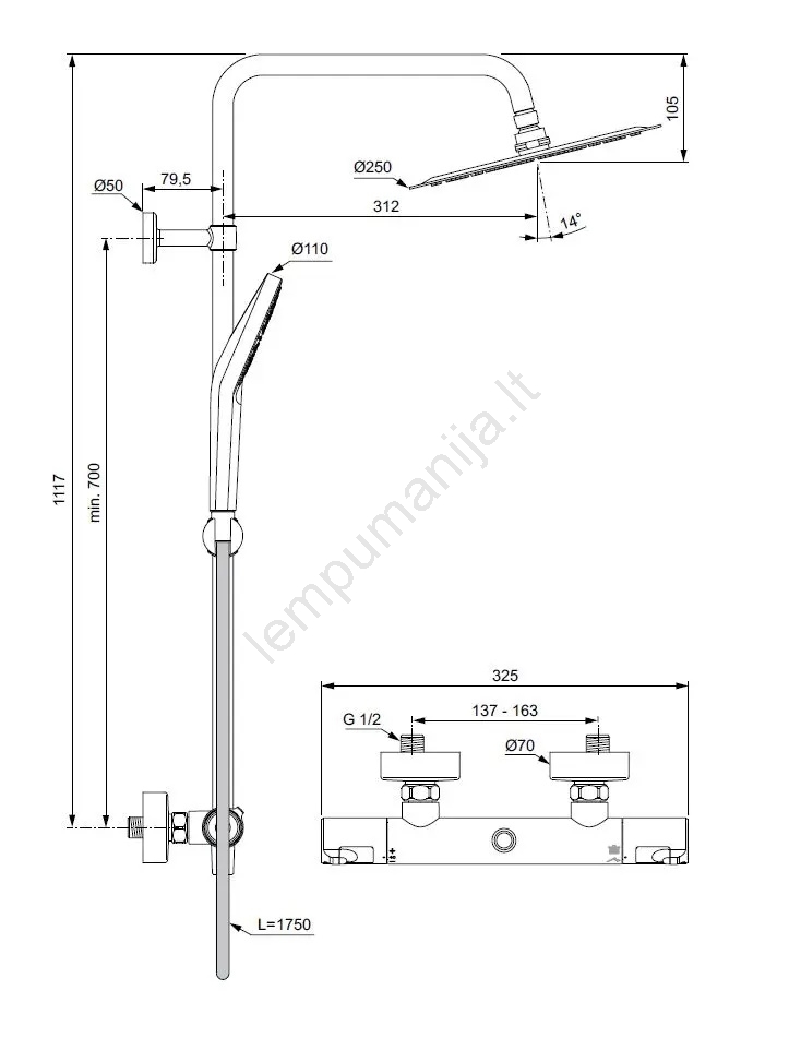 • Termostatinis dušo maišytuvas skirtas sieninei montuotei su 150 mm tarpeliu ir valdomas rankenėlėmis.