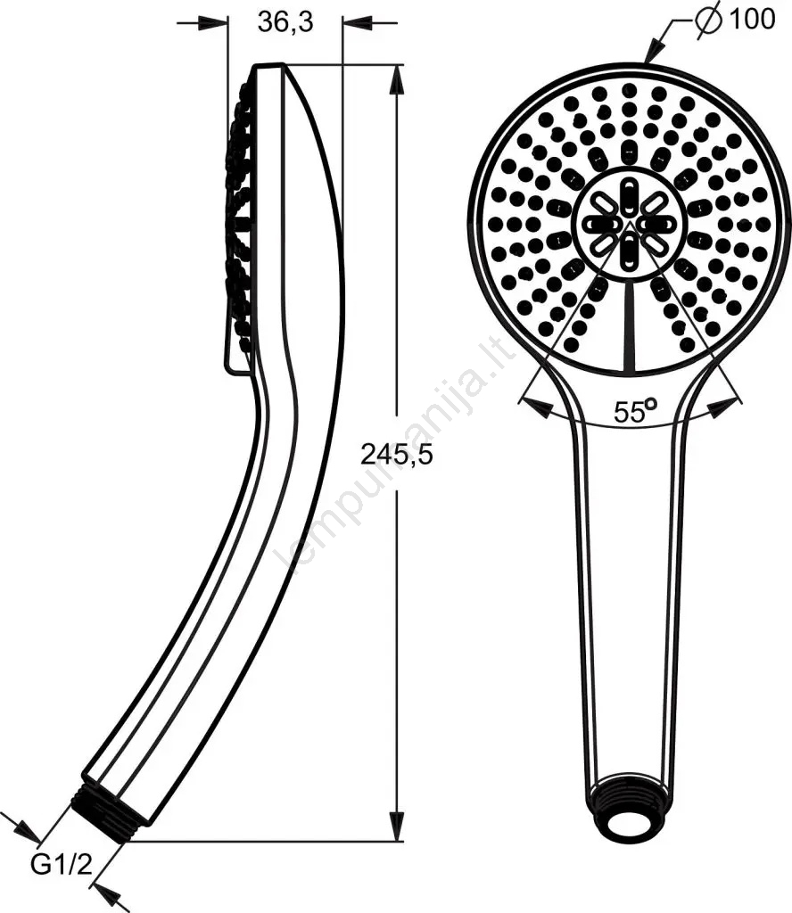 • Rankinės dušo galvutės prijungimo sriegis yra standartinis G 1/2.