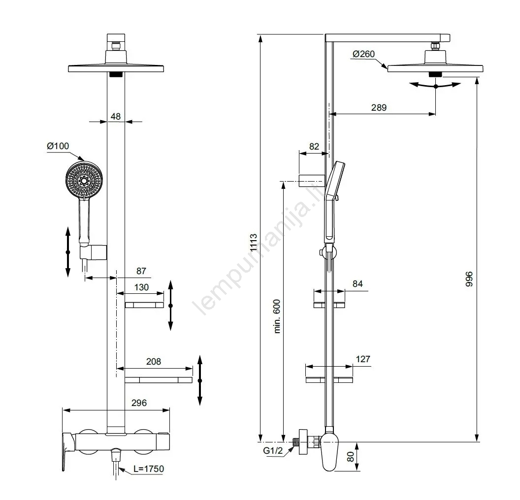 • Dušo strypas ilgis 1113 mm turi slankiojantį laikiklį, dvi aukščiu reguliuojamas lentynėles (įskaitant muilinę) ir leidžia montuoti su min. 600 mm tarpu.