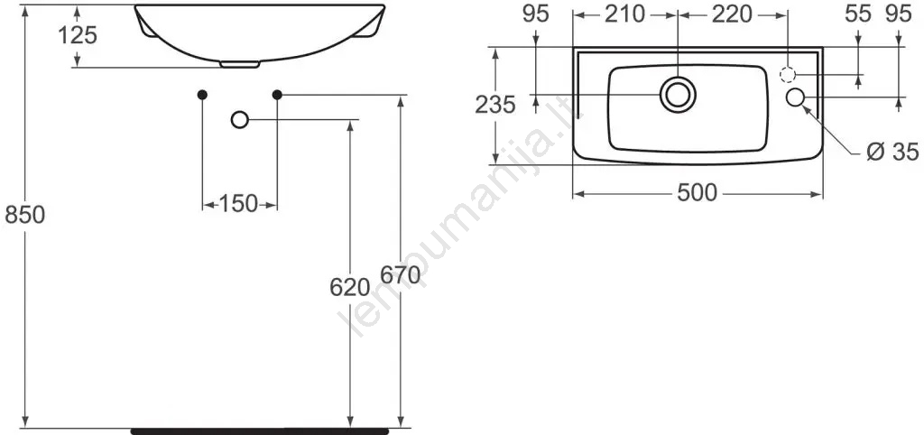 • Praustuvas turi vieną iš anksto paruoštą angą maišytuvo montavimui, esančią dešinėje pusėje.