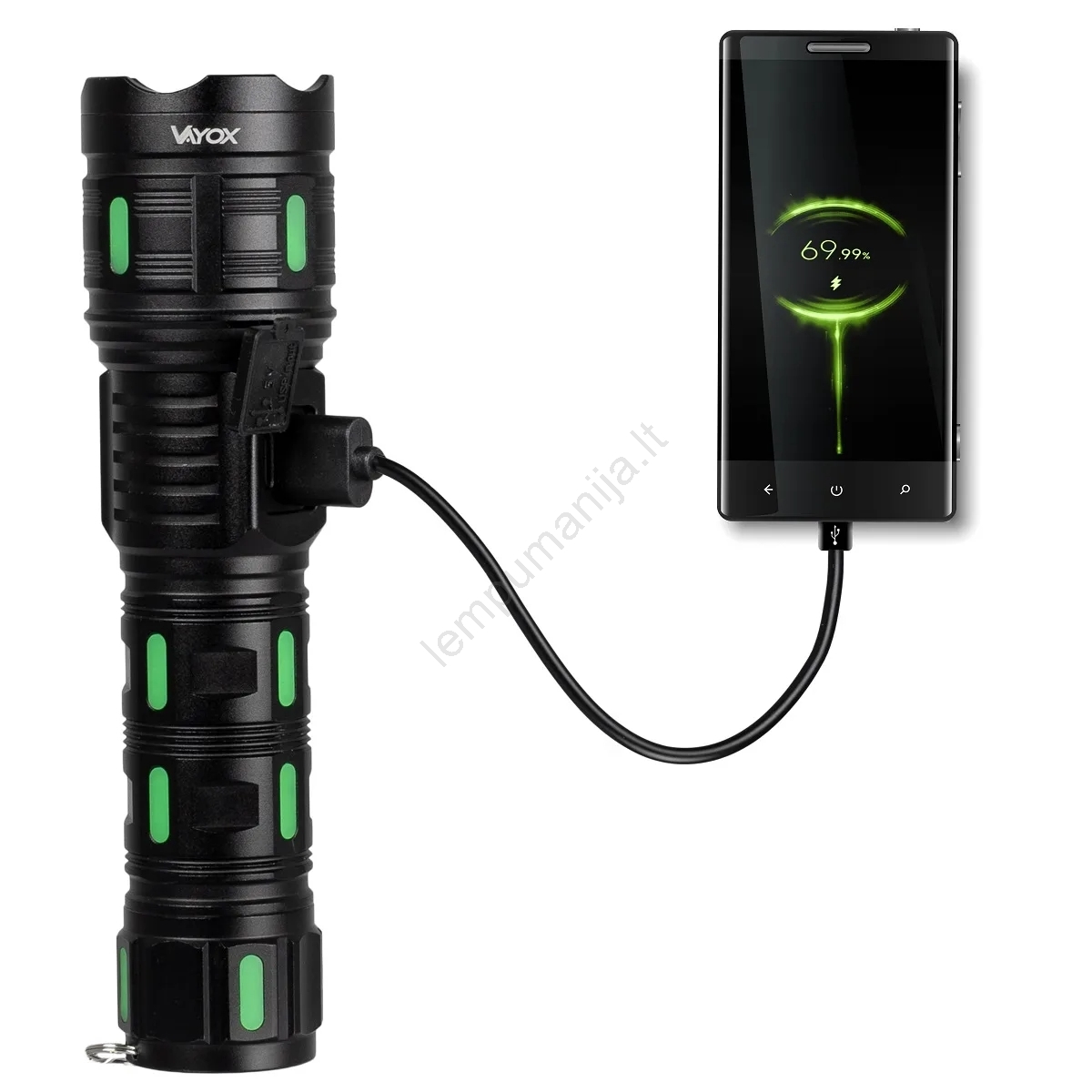 • Žibintuvė turi USB prievadą išoriniams įrenginiams įkrovimui.