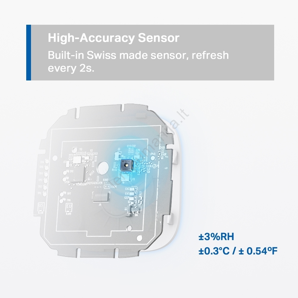 • Realaus laiko stebėjimas ir tikslus matavimas - aptinka temperatūrą ir drėgmę realiu laiku su dideliu tikslumu. (Matavimo tikslumas: ±0,3 ºC/ ±0,54 º, ±3 % santykinės drėgmės).