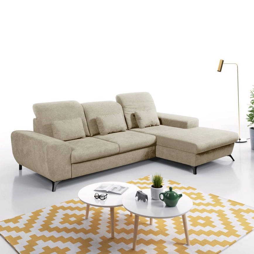 • Išskleidžiama apmušta L formos kampinė sofa ALTA, dešininė, smėlio spalvos, su daiktų laikymo vieta