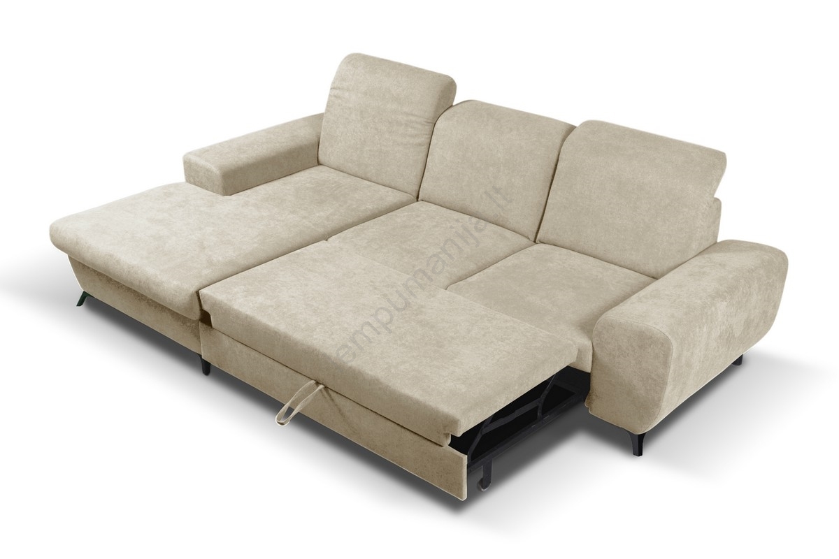ALTA išskleidžiama kairinė L formos apmušta kampinė sofa su daiktų laikymo vieta, smėlio spalvos