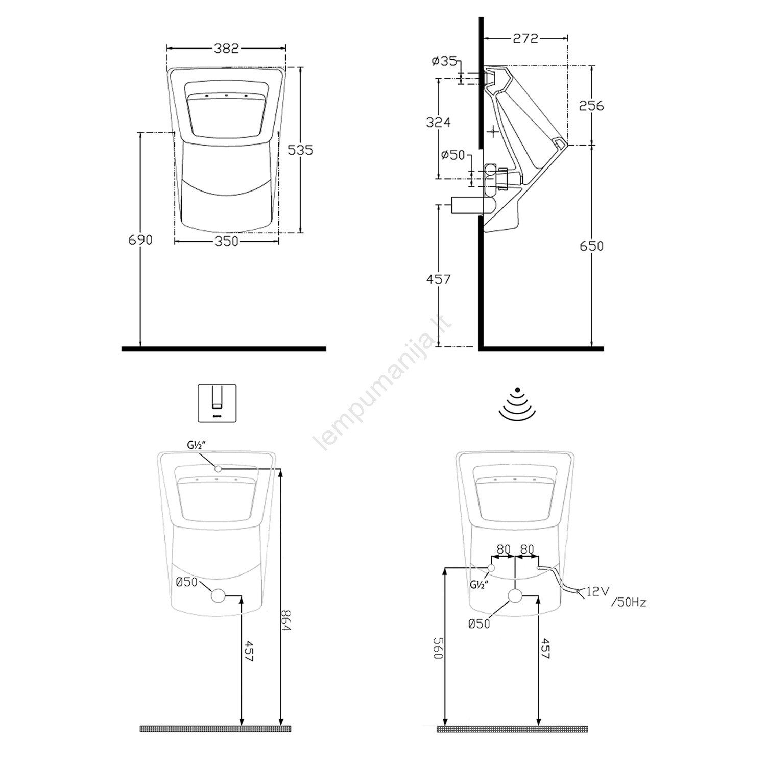 • Vandens įvadas ½" ir nuotekų skersmuo 50 mm.