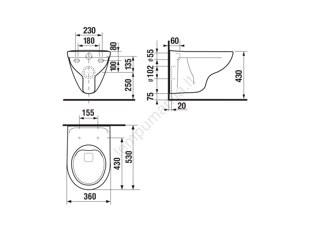 • Pakabinamas klozetas be tradicinio praplovimo žiedo.