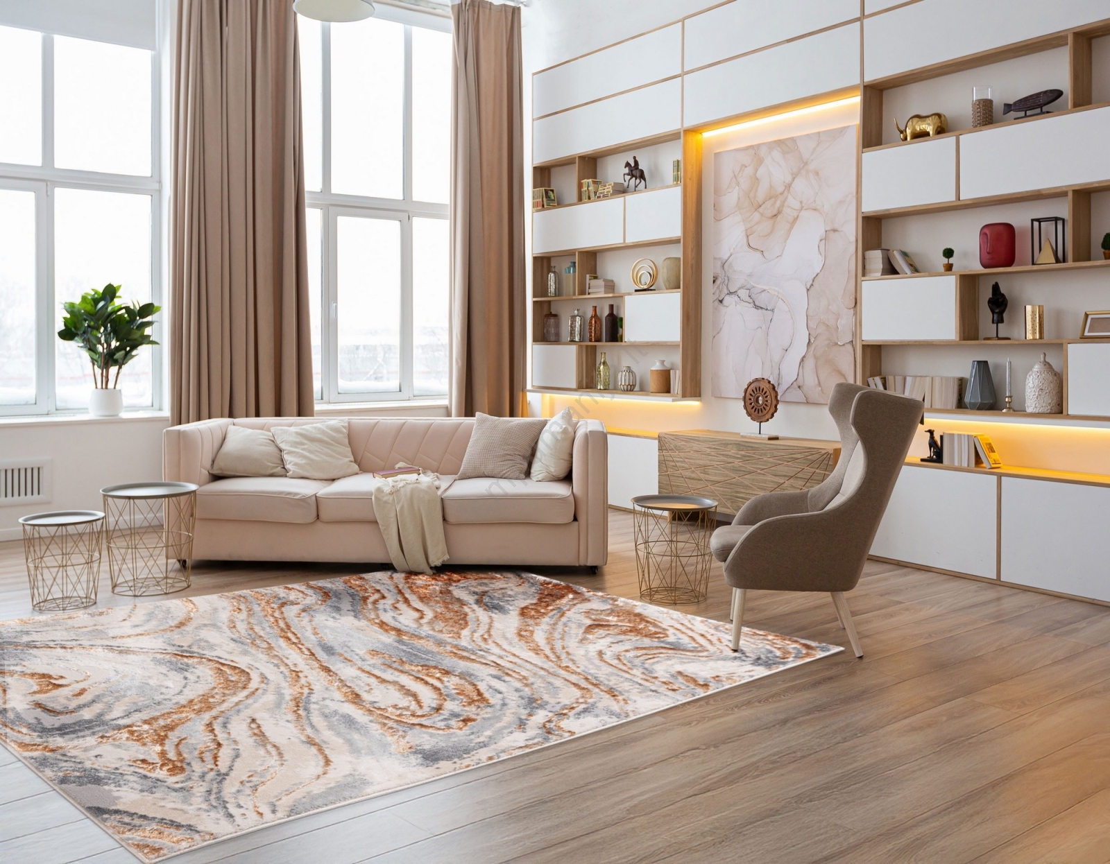 • Estetiškas ir modernus kilimas su subtiliais abstrakčiais raštais.