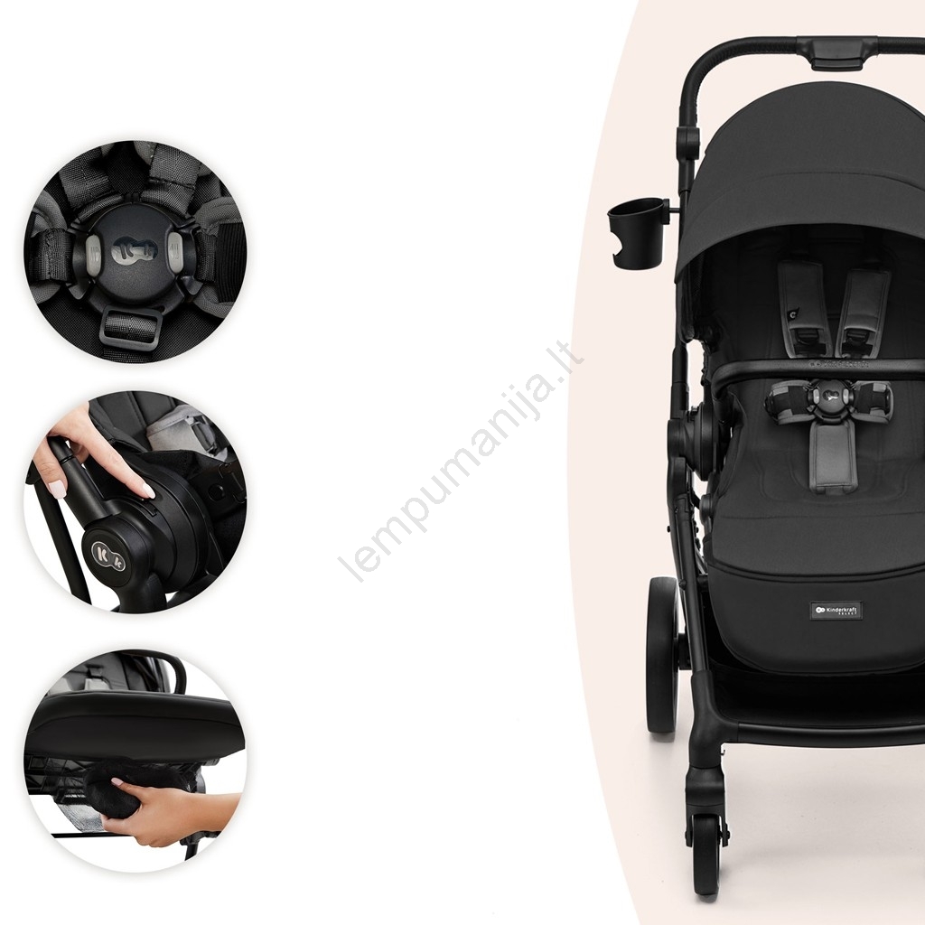 • Reguliuojama stūmimo rankena, lengvai pritaikoma pagal tėvų ūgį.