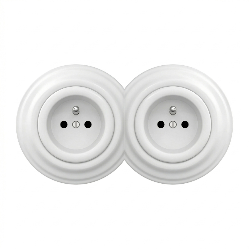 • Kliklap - dviguba retro rozetė namams su rėmeliu, 230V, keraminė, balta