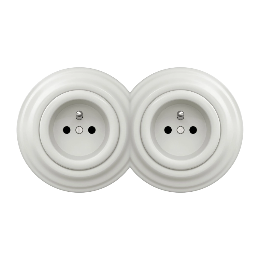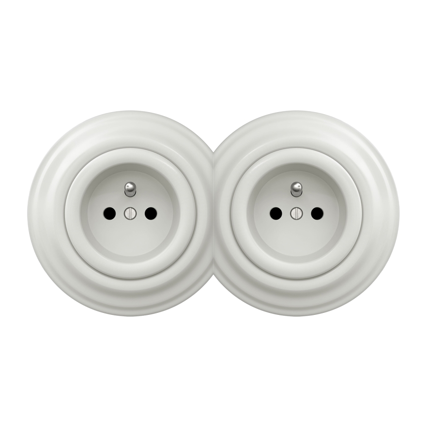 Kliklap - dviguba retro rozetė namams su rėmeliu, 230V, keraminė, balta