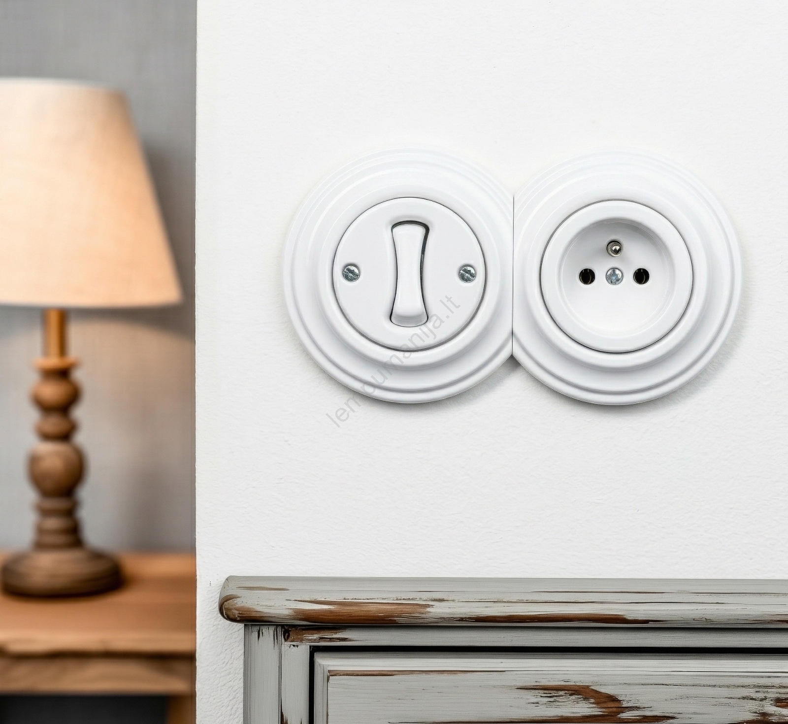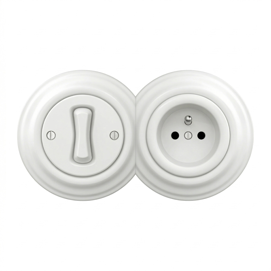 • Kliklap - Retro vieno poliaus jungiklis Nr. 1 ir 230 V lizdas su rėmeliu, keraminis baltas