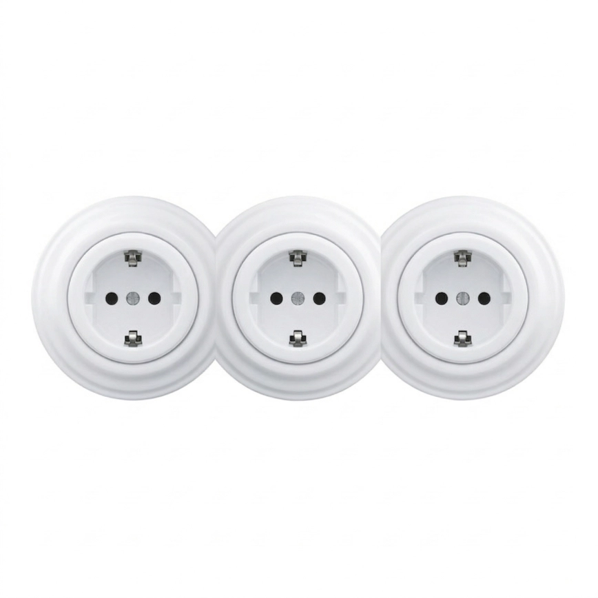 • Kliklap - Trigubas retro namų lizdas su rėmeliu SCHUKO 230V, keraminis, baltas